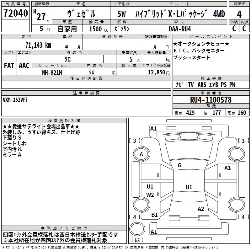 HONDA VEZEL hybrid X.L pack 4WD 2015 года - лот 72040 от 28.10.2025