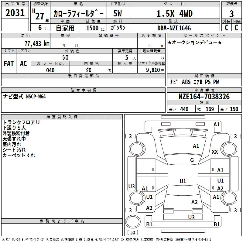 С данным лотом столкнулись на строгом Тойотовском аукционе TAA. Как видим из замечаний на схеме в аукционном листе: правое переднее крыло было заменено, на пятой двери большая вмятина(хотя мы ее не видим), и на левом пороге заметная вмятина, по кузову царапины по лаку. И такие же замечания бывают на аукционном листе с оценкой 4 балла.