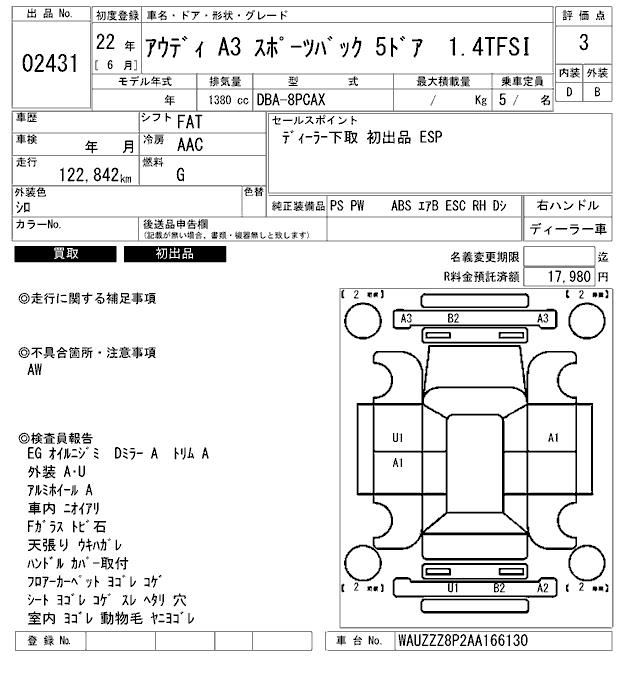 AUDI A3 1.4TFSI - лот 2431