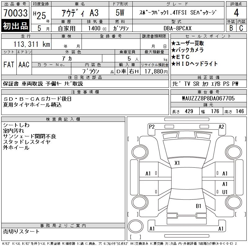 AUDI A3 SPORTBACK 1.4TFSI - лот 70033