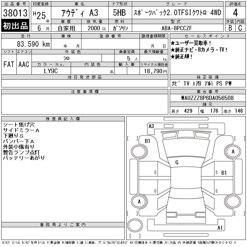 AUDI A3 SPORTBACK 2.0TFSI 4WD - лот 38013
