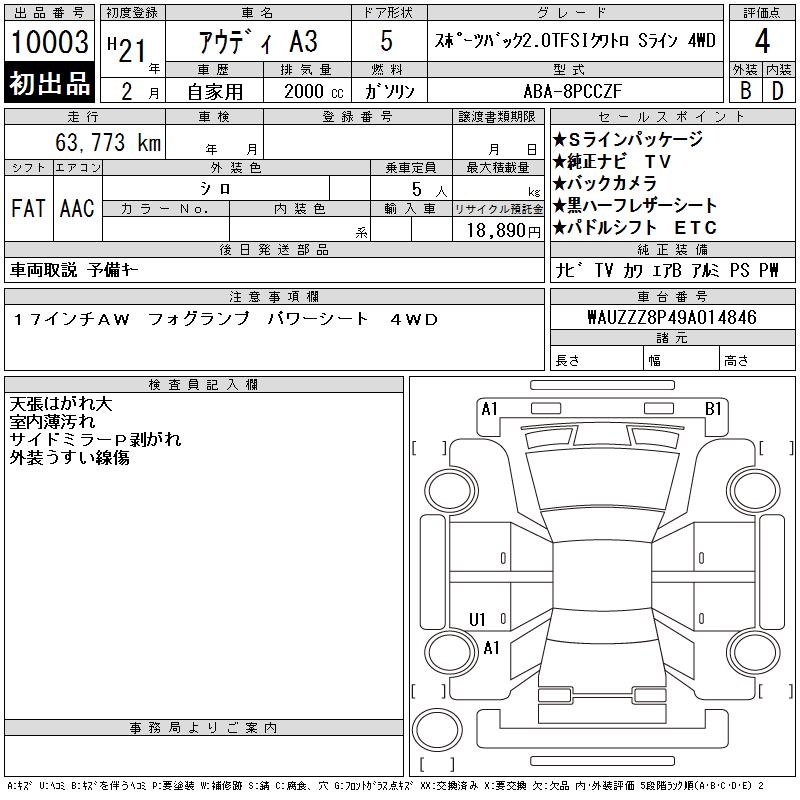 AUDI A3 SPORTBACK 2.0TFSI 4WD - лот 10003