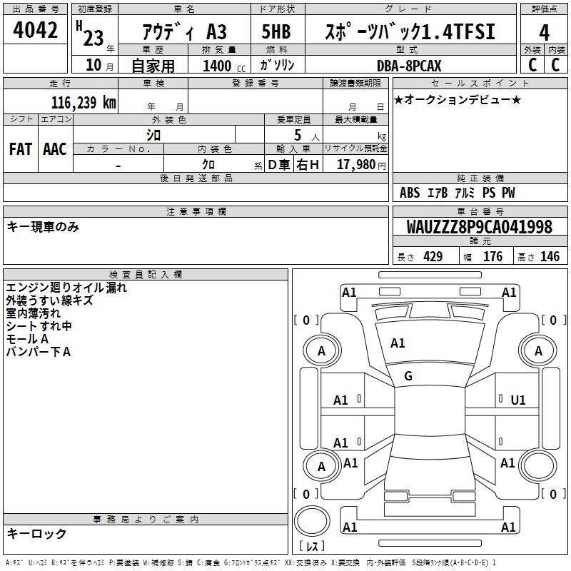 AUDI A3 SPORTBACK 1.4TFSI - лот 4042