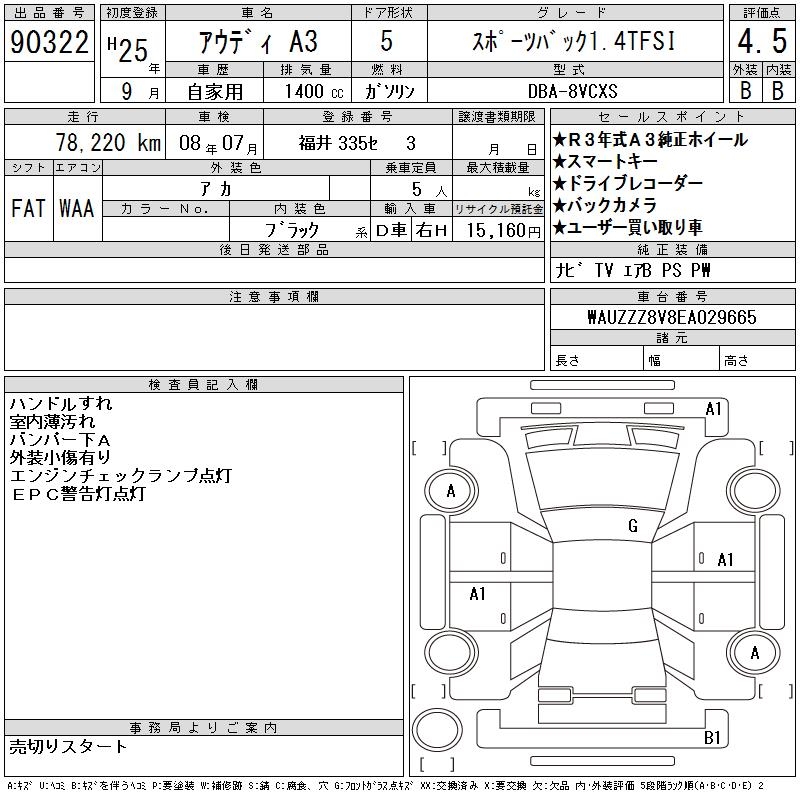 AUDI A3 SPORTBACK 1.4TFSI - лот 90322
