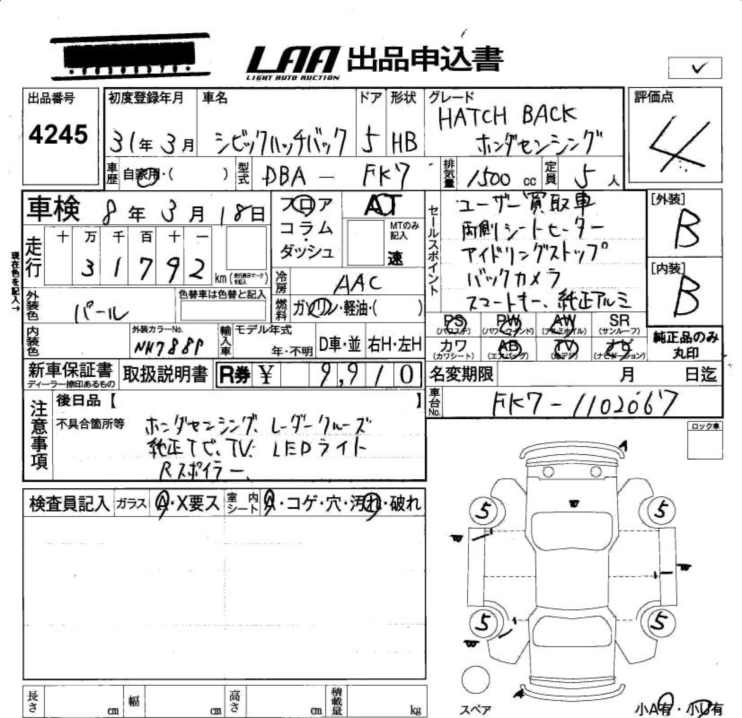 HONDA CIVIC HATCHBACK HONDA SENSING - лот 4245