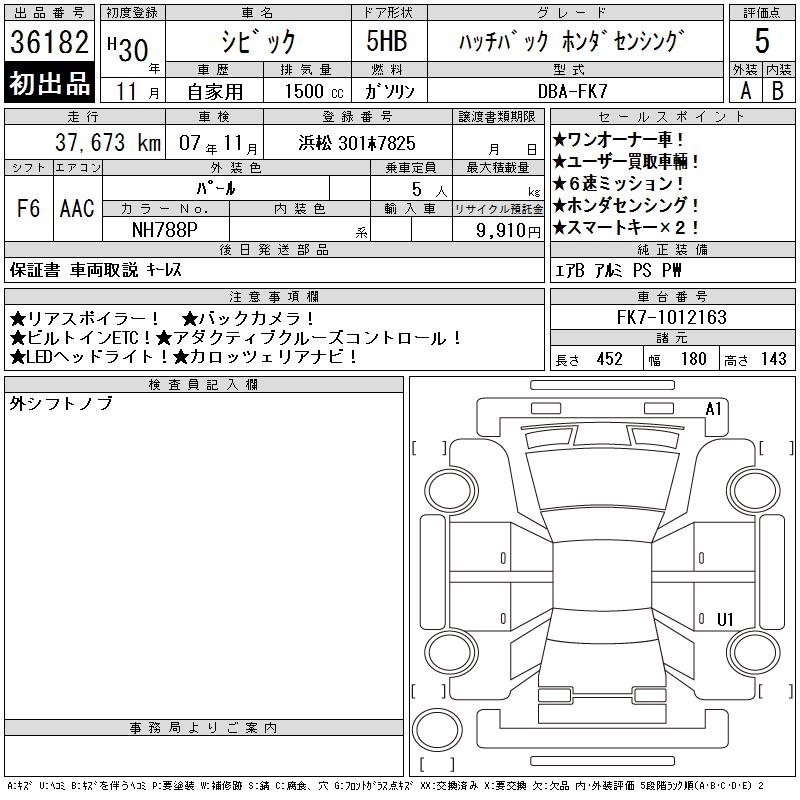HONDA CIVIC HATCHBACK HONDA SENSING - лот 36182