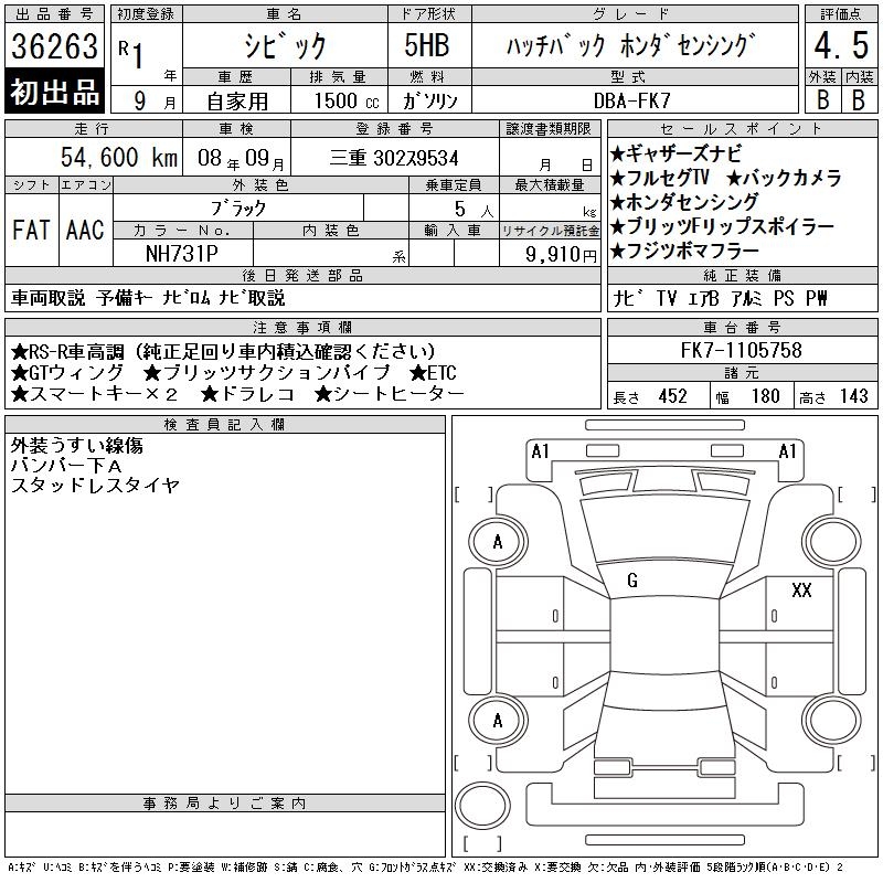 HONDA CIVIC HATCHBACK HONDA SENSING - лот 36263