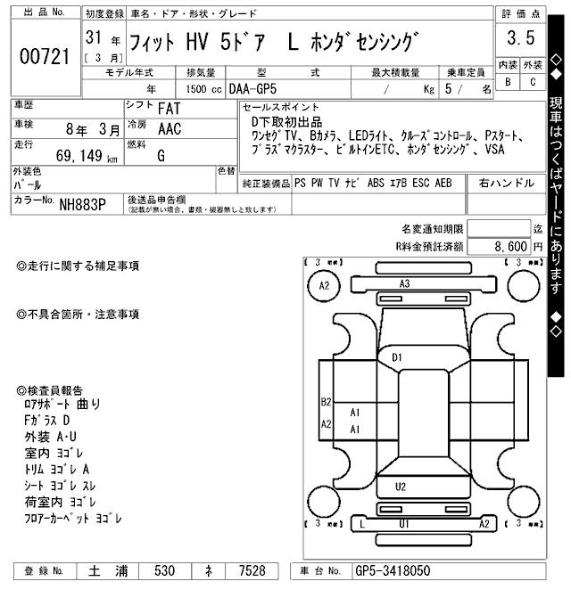 HONDA FIT HYBRID L HONDA SENSING - лот 721