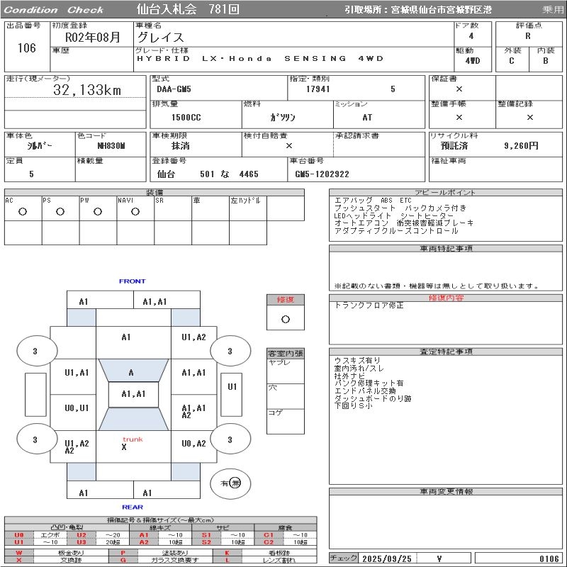 HONDA GRACE HYBRID LX*Honda SENSING 4WD - лот 106