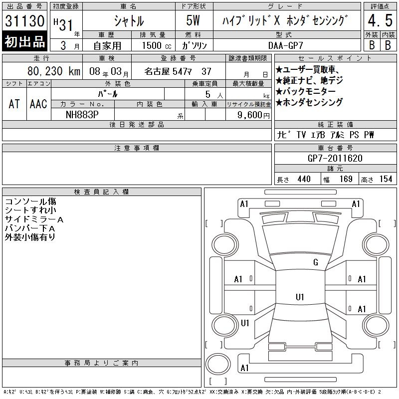 HONDA SHUTTLE HYBRID X HONDA SENSING - лот 31130