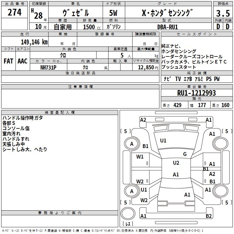 HONDA VEZEL X* HONDA SENSING - лот 274