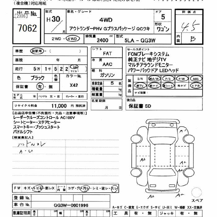 MITSUBISHI OUTLANDER 4WD PHEV G PLUS PACKAGE QC EXIST - лот 7062