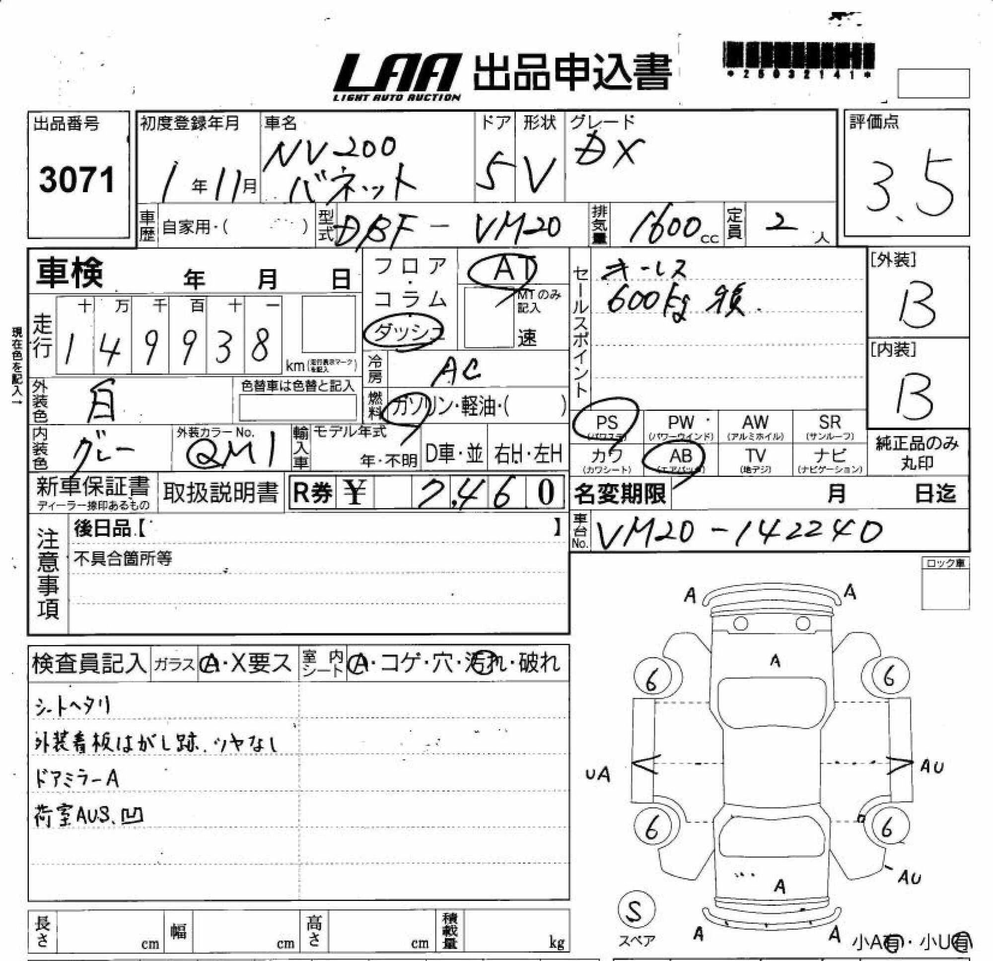 NISSAN NV200 VANETTE VAN - лот 3071