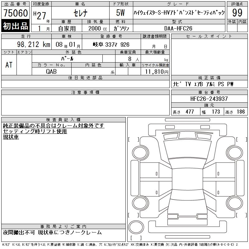 NISSAN SERENA H STAR S-HV ADVAN SE-FP - лот 75060