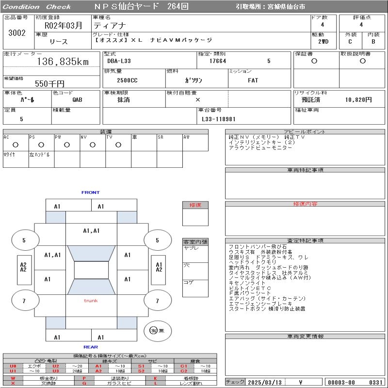 NISSAN TEANA [ RECOMMENDED ]XL NAVIGATION AVM PACKAGE - лот 3002