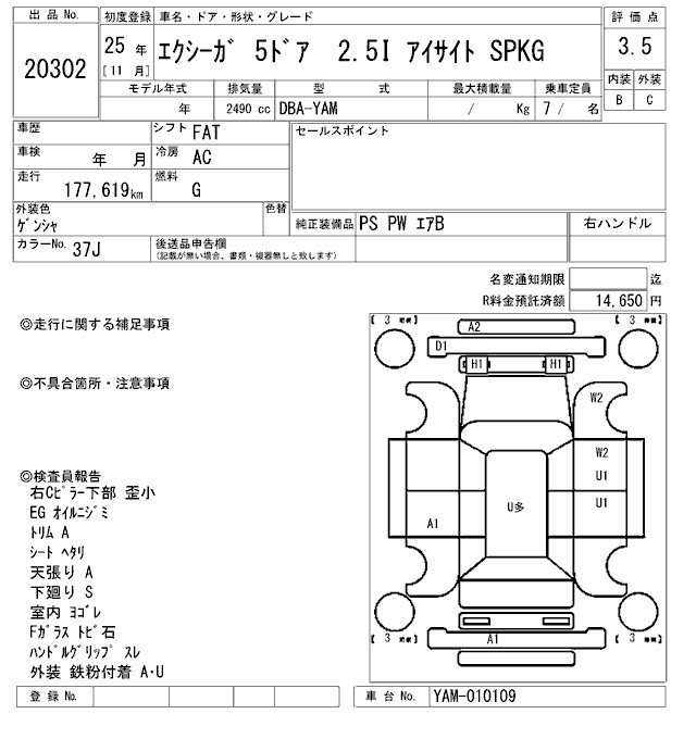 SUBARU EXIGA 2.5I EYESIGHT SPKG - лот 20302