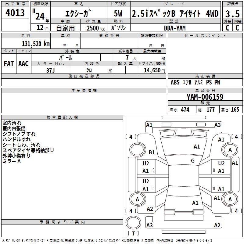 SUBARU EXIGA 2.5I SPECIFICATIONS B EYESIGHT 4WD - лот 4013