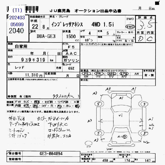 SUBARU IMPREZA ANESIS - лот 11696