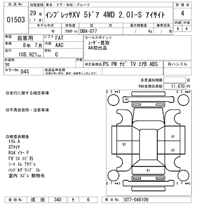 SUBARU IMPREZA XV - лот 1503