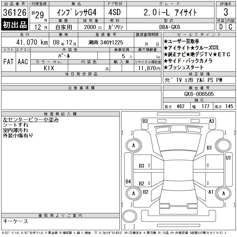 SUBARU IMPREZA G4 2.0I-L EYESIGHT - лот 36126