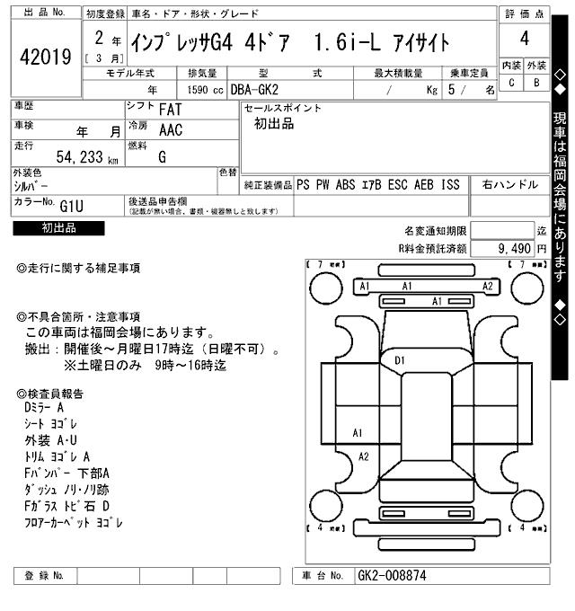 SUBARU IMPREZA G4 1.6I-L EYESIGHT - лот 42019
