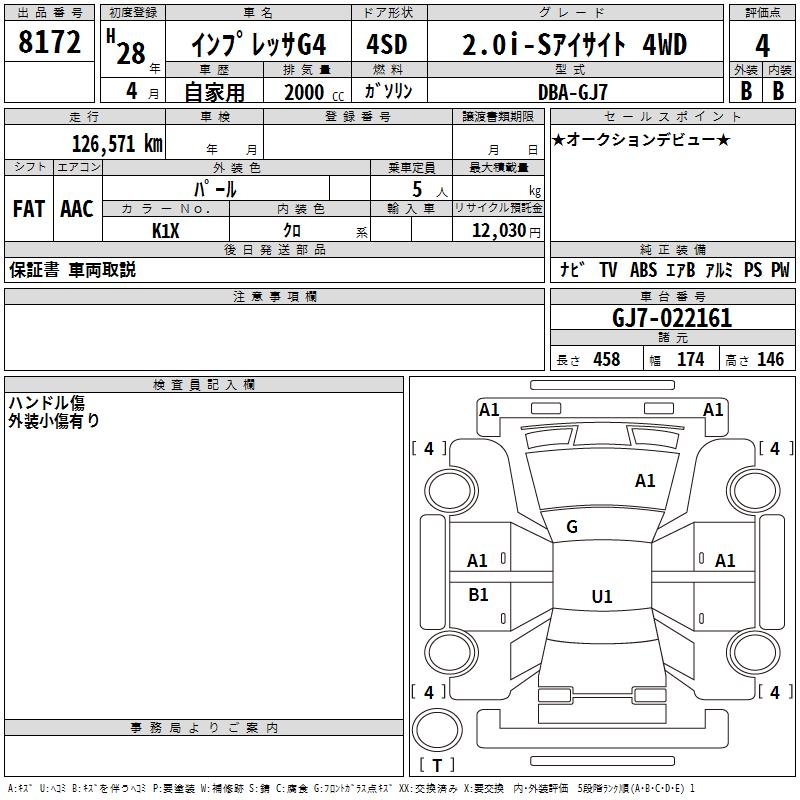 SUBARU IMPREZA G4 2.0I-S EYESIGHT 4WD - лот 8172