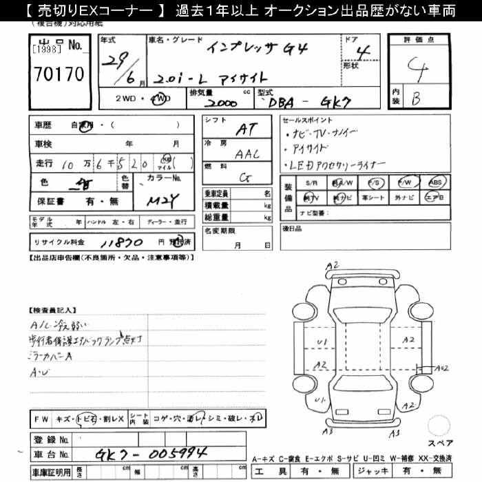 SUBARU IMPREZA G4 4WD 2.0I-L EYESIGHT - лот 70170