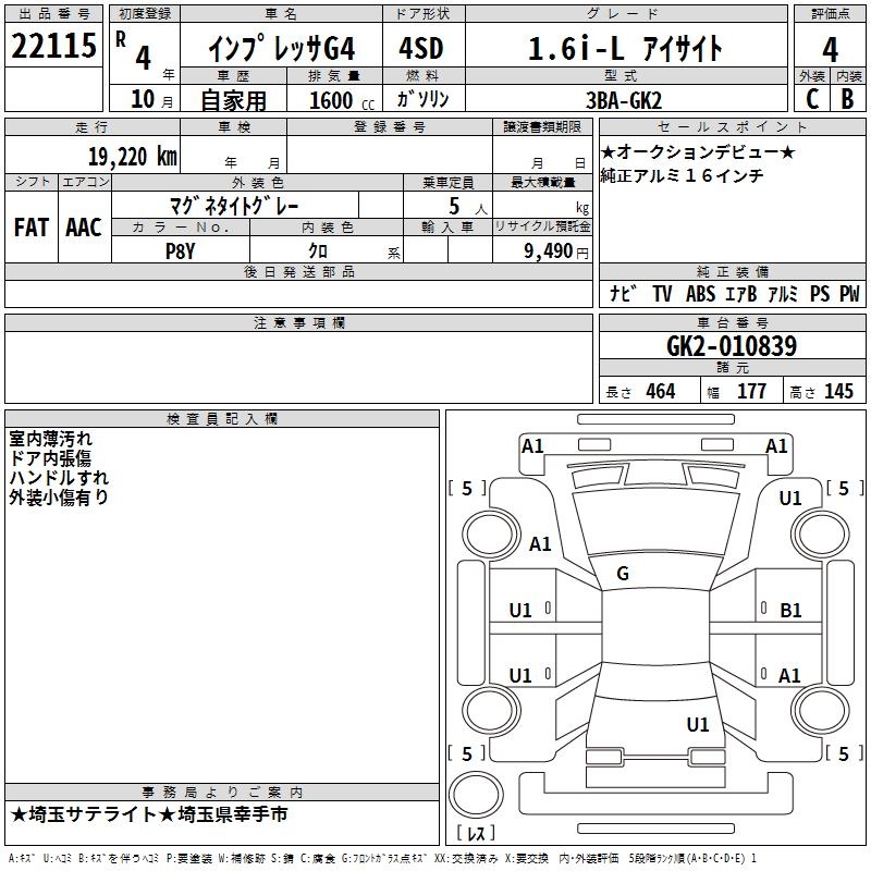 SUBARU IMPREZA G4 1.6I-L EYESIGHT - лот 22115