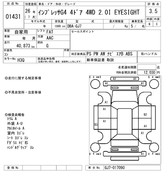 SUBARU IMPREZA G4 2.0I EYESIGHT - лот 1431