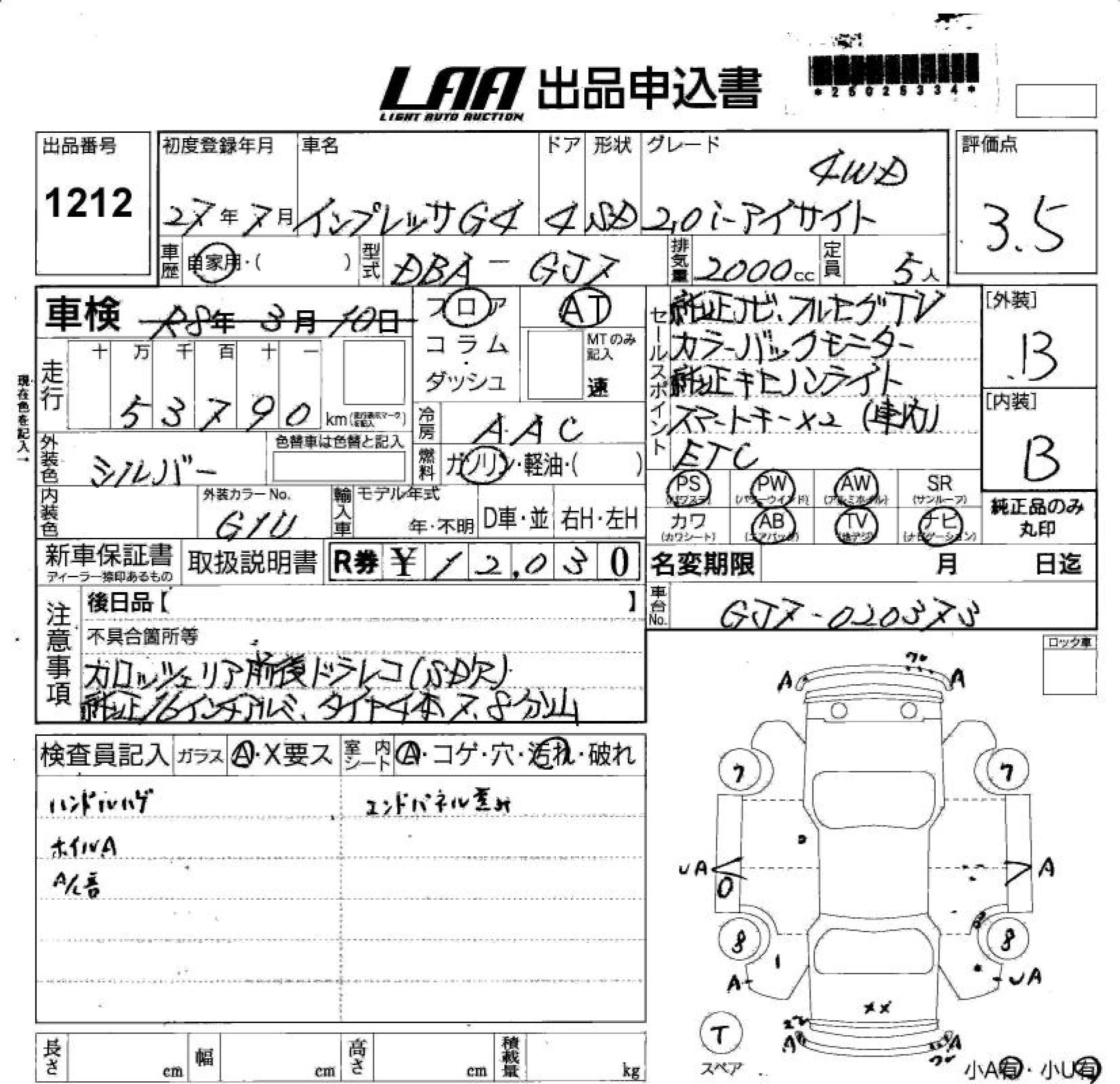 SUBARU IMPREZA G4 2.0I EYESIGHT 4WD - лот 1212