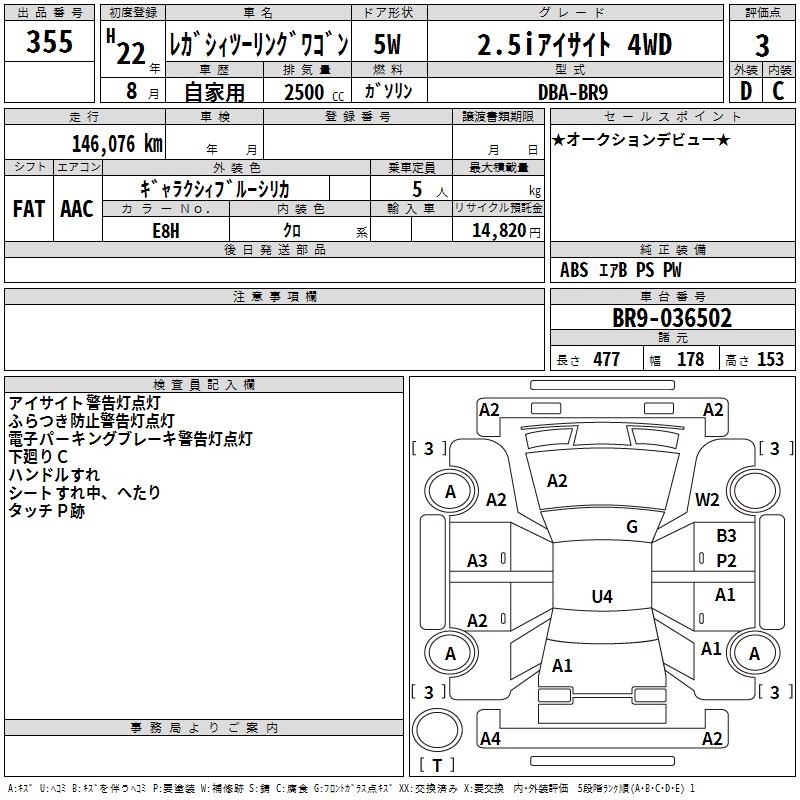 SUBARU LEGACY TOURING WAGON 2.5I EYESIGHT 4WD - лот 355