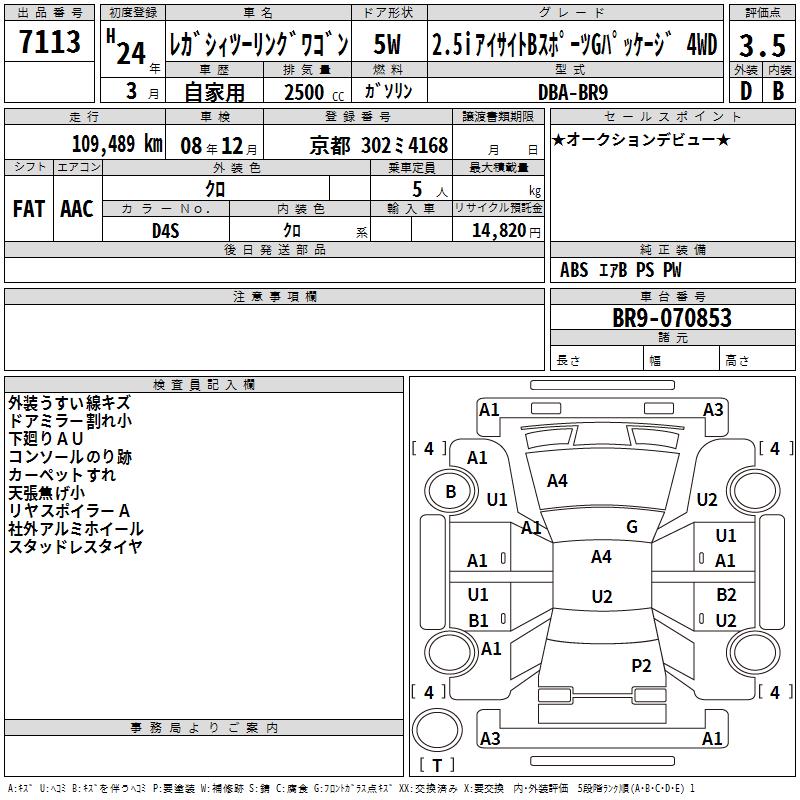 SUBARU LEGACY TOURING WAGON 2.5I EYESIGHT B SPORT G 4WD - лот 7113