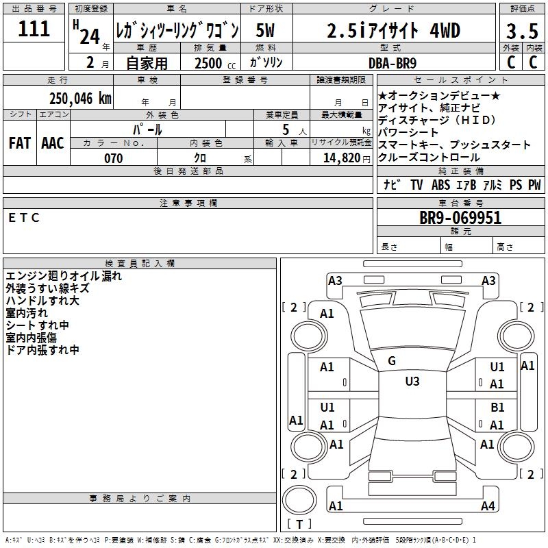 SUBARU LEGACY TOURING WAGON 2.5I EYESIGHT 4WD - лот 111