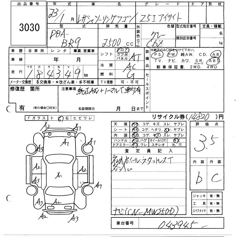 SUBARU LEGACY TOURING WAGON 2.5I EYESIGHT - лот 3030