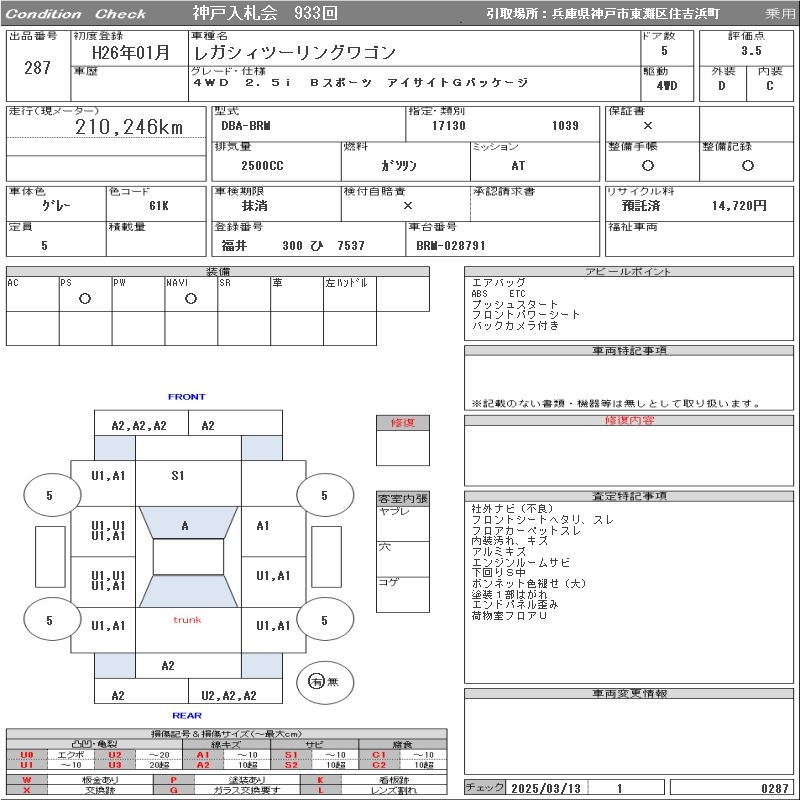 SUBARU LEGACY TOURING WAGON 4WD 2.5I B SPORT EYESIGHT G PACKAGE - лот 287