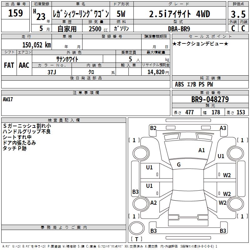 SUBARU LEGACY TOURING WAGON 2.5I EYESIGHT 4WD - лот 159