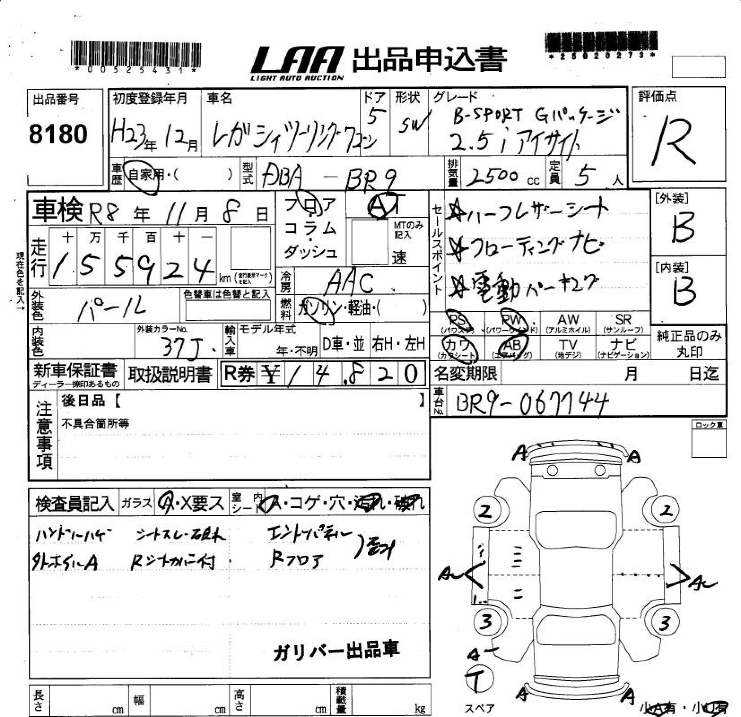 SUBARU LEGACY TOURING WAGON 2.5I EYESIGHT B SPORT - лот 8180