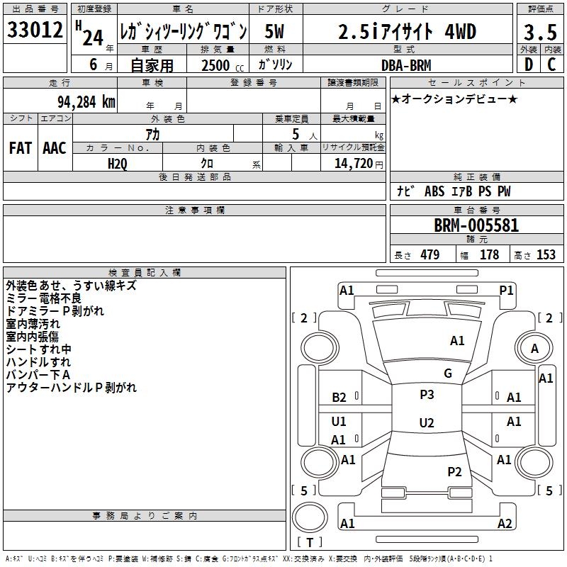 SUBARU LEGACY TOURING WAGON 2.5I EYESIGHT 4WD - лот 33012