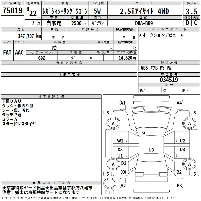 SUBARU LEGACY TOURING WAGON 2.5I EYESIGHT 4WD - лот 75019