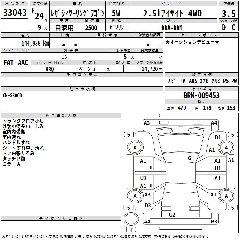 SUBARU LEGACY TOURING WAGON 2.5I EYESIGHT 4WD - лот 33043