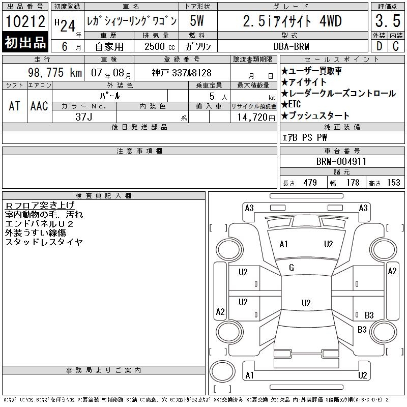 SUBARU LEGACY TOURING WAGON 2.5I EYESIGHT 4WD - лот 10212