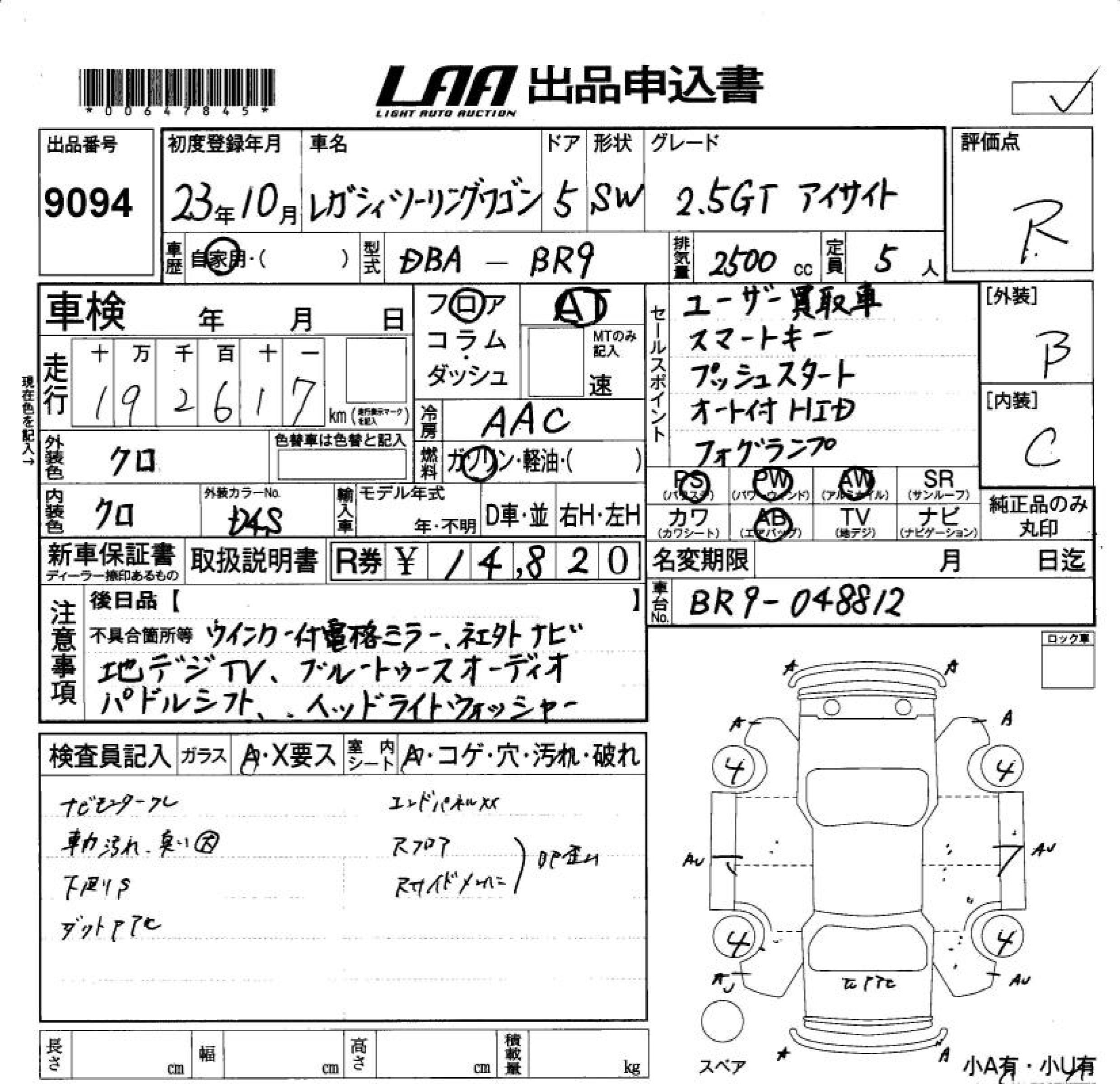 SUBARU LEGACY TOURING WAGON 2.5GT EYESIGHT - лот 9094