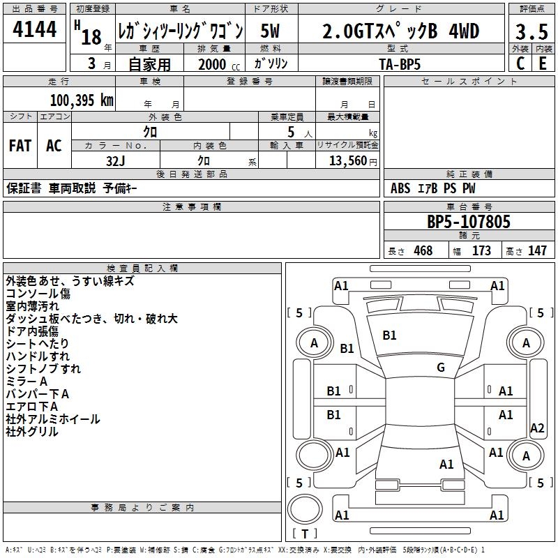 SUBARU LEGACY TOURING WAGON 2.0GT SPECIFICATIONS B 4WD - лот 4144