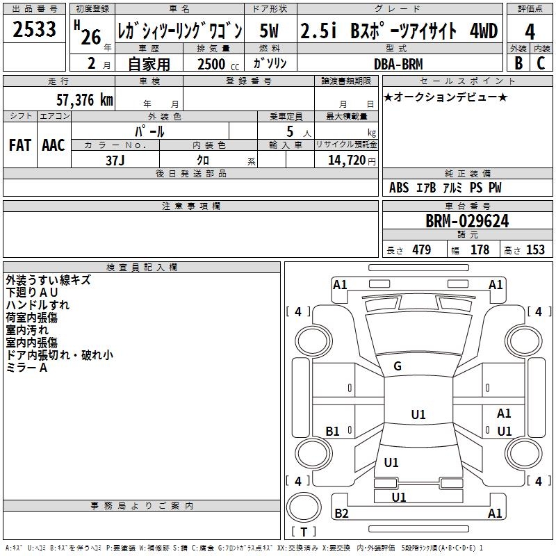 SUBARU LEGACY TOURING WAGON 2.5I B SPORT EYESIGHT 4WD - лот 2533