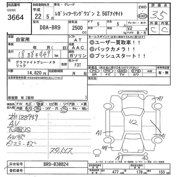 SUBARU LEGACY TOURING WAGON 4WD 2.5GT EYESIGHT - лот 3664