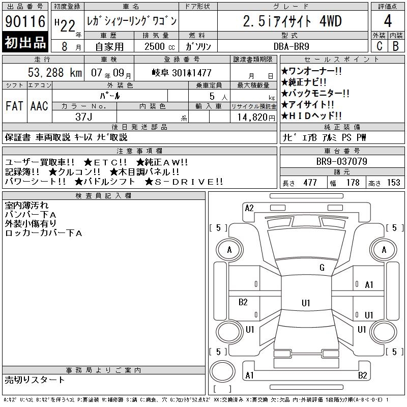 SUBARU LEGACY TOURING WAGON 2.5I EYESIGHT 4WD - лот 90116