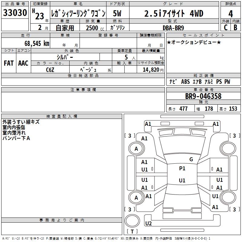 SUBARU LEGACY TOURING WAGON 2.5I EYESIGHT 4WD - лот 33030