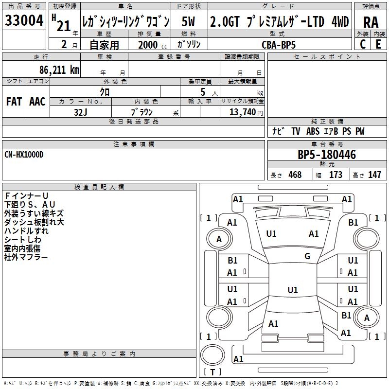 SUBARU LEGACY TOURING WAGON 2.0GT PREMIUM LEATHER 4WD - лот 33004