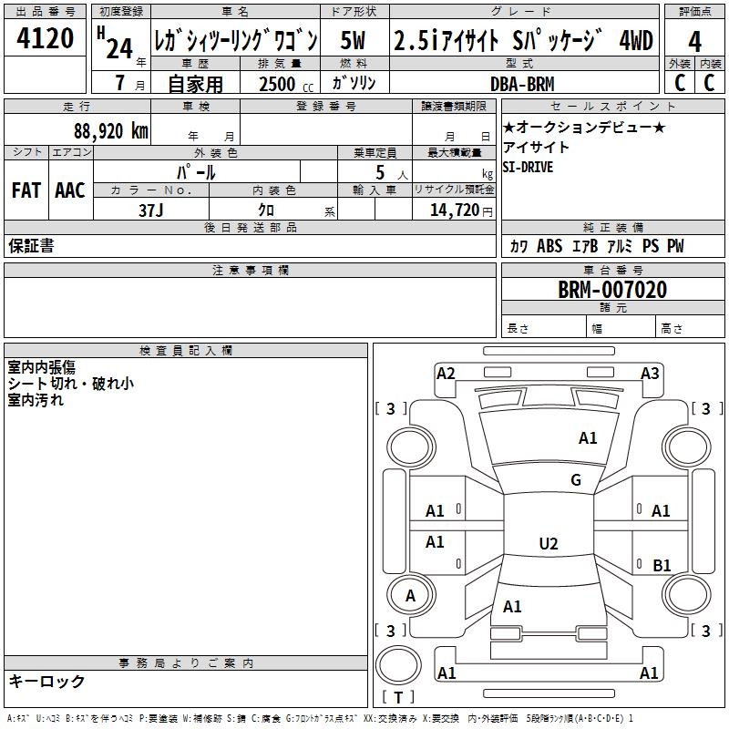SUBARU LEGACY TOURING WAGON 2.5I EYESIGHT S PACK 4WD - лот 4120