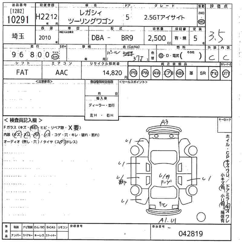 SUBARU LEGACY TOURING WAGON 2.5GT EYESIGHT - лот 10291